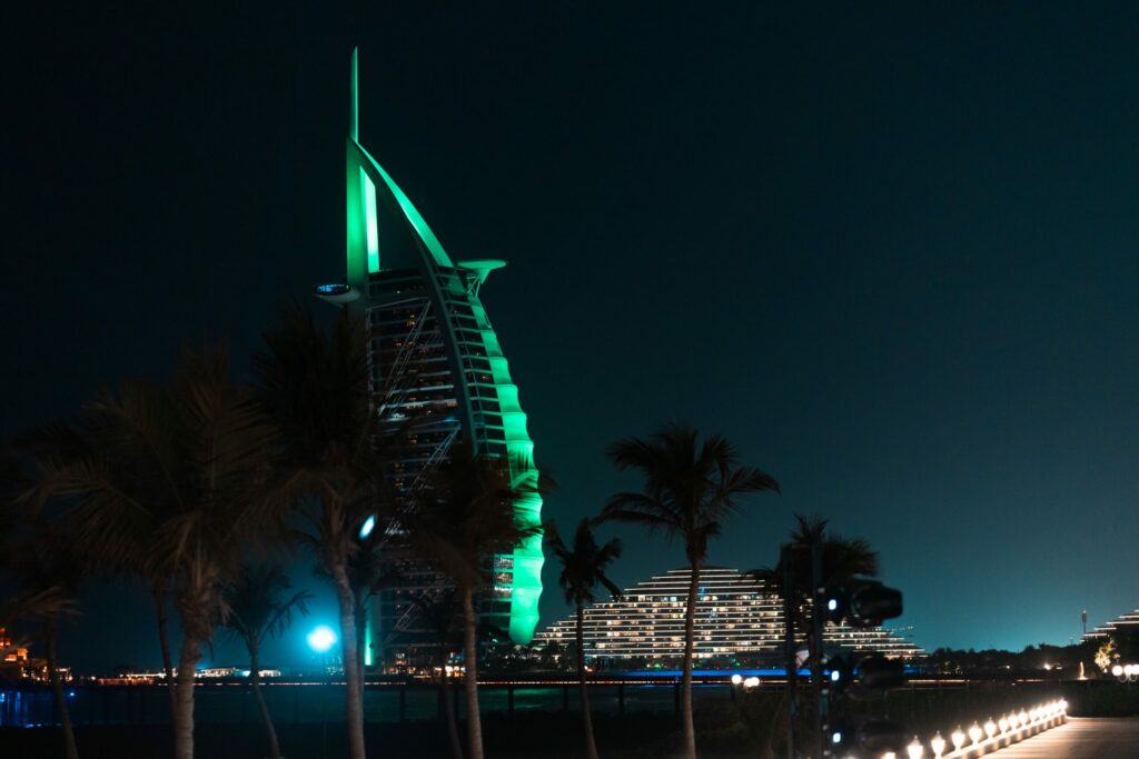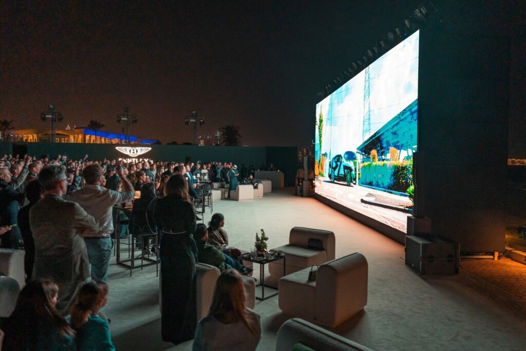 Guests were welcomed to the gardens of the former royal palace of Sheikha Sanaa Bint Mana Al Maktoum on the Dubai shoreline, overlooked by the Burj Al Arab which was illuminated in Bentley green for the occasion.